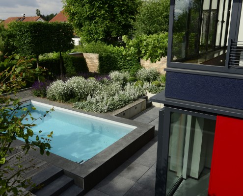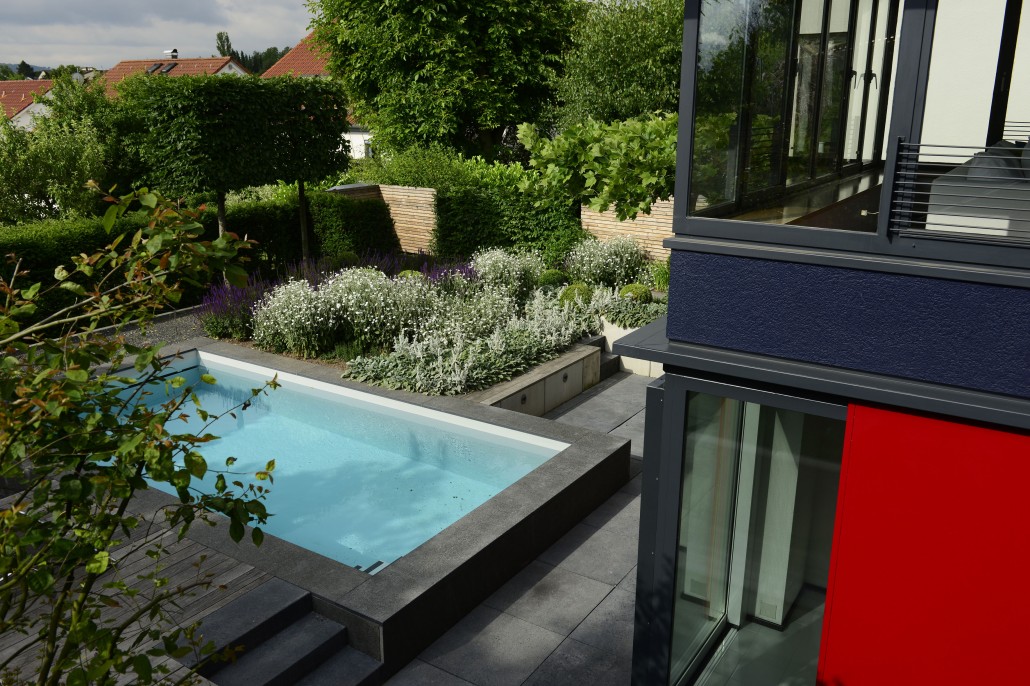 Die Bauherren möchten morgens im Pool ihrem Wunsch nach körperlicher Fitness und Erfrischung nachkommen.